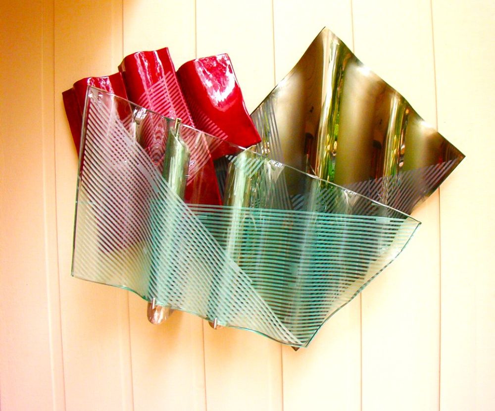 John Luebtow has consistently addressed a quadrum of fundamental sculptural issues throughout his career: line, form, space, and light. These are broad considerations, to be sure; to a certain extent, they are inherent to all visual art media. What is significant in Luebtow’s fidelity to this set of issues is not only his tenacity in the unraveling of their mysterious laws, but also the extraordinarily wide range of approaches he has drawn to them. The mystery he pursues is the technical spiritual identify of his medium. He searches within the sovereign form of his subjects for the abstract evidence of the energetic rhythm of movement. At times this search may appear divergent and often bifurcated: one venue yielding images of bondage constraint and containment evoking a mixture of pleasure and pain; another emanating variations of surface patterns that are highly stylized, manipulating and controlling visual movement in and on the form, while defining the form within the glass. Yet another evolving through a progression of smaller Marquette sized pieces containing wave-like patterns of intricately bent glass presented in single and double free-standing metal encasements, come of which are hinged to allow the viewer to alter their relationships.